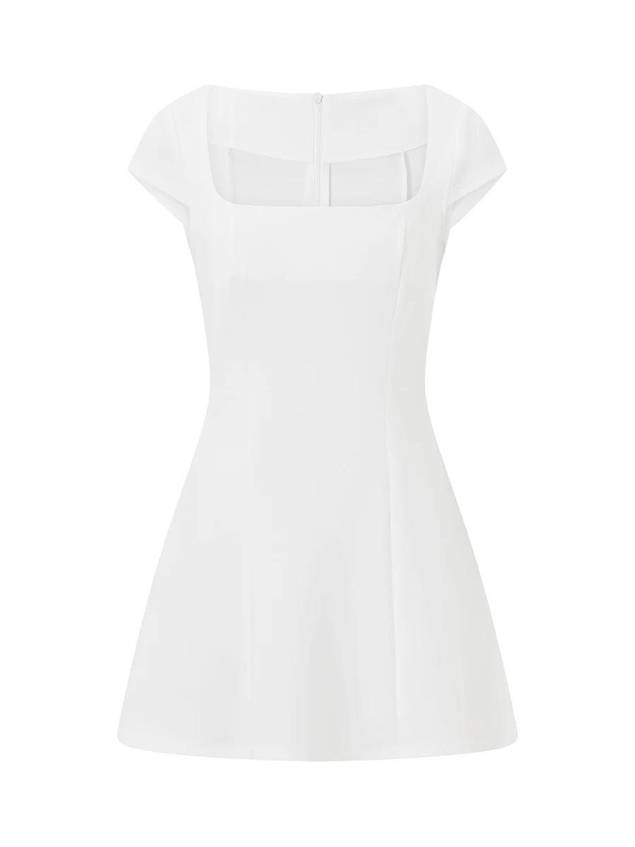 Women’s Cap Sleeves Mini Dress Solid Color Square Neck Slim A-Line Dress with Pockets